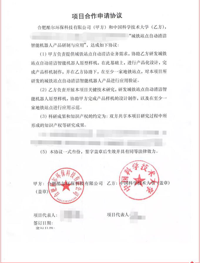 為加快推進(jìn)科技型企業(yè)與高校產(chǎn)學(xué)研合作,2021年8月26日中國(guó)科學(xué)技術(shù)大學(xué)與合肥酷爾環(huán)??萍加邢薰揪?ldquo;城鐵站點(diǎn)自動(dòng)清潔智能機(jī)器人產(chǎn)品研制與應(yīng)用”項(xiàng)目達(dá)成了戰(zhàn)略性合作協(xié)議。